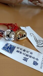 舞台上の太鼓衆から参加者に振る舞われた鈴もゲット。いい音がする~♪