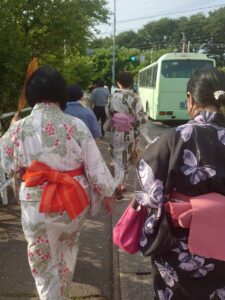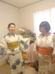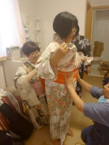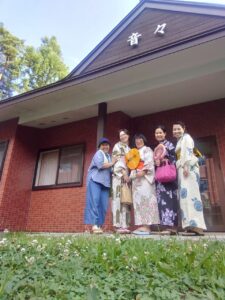 レンタル浴衣が一枚余分に準備されていて、なんと私にぴったり!皆に助けてもらいながら着れてしまった!