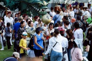 岐阜の鵜飼でゲットした団扇を片手にまつりへ繰り出す。なんと産院音々からは歩いて行ける距離なのだ。