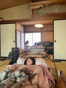 窓の外には雪を被った甲斐駒ヶ岳が臨める。着物好きの彼女。お産の時には壁に着物が4着位タペストリーのように飾られていた。